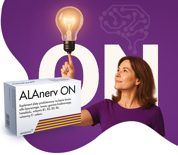 ALAnerv ON to suplement diety, zawierający specjalnie dobrane składniki – produkowany na bazie kwasu alfa-liponowego, kwasu gamma-linolenowego, honokiolu, witamin B1, B2, B5, B6, witaminy E i selenu.